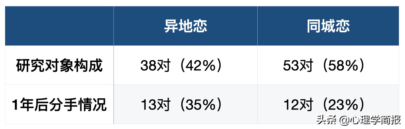 如上表所示,在這些實驗對象中,有42%的情侶是異地戀。在一年後,35%的異地戀情侶分手,而同城戀中,只有23%的情侶分手。從分手比例上看,異地戀情侶分手率比同城戀高[3]。