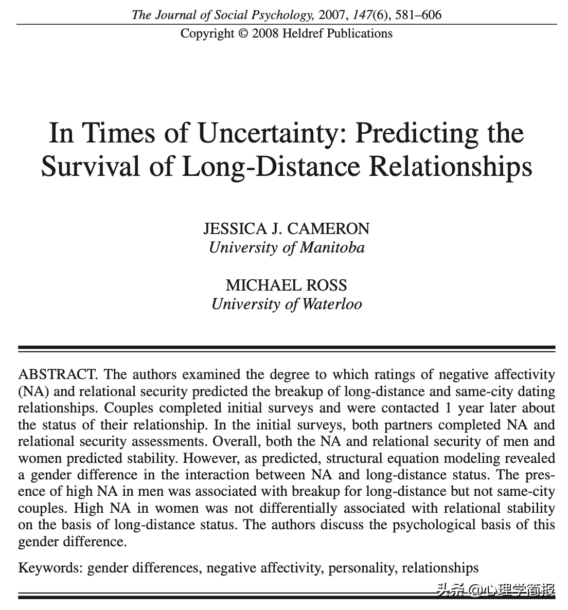 [3]Jessica J. Cameron & Michael Ross (2007) In Times of Uncertainty: Predicting the Survival of Long-Distance Relationships, The Journal of Social Psychology, 147:6, 581-606.
