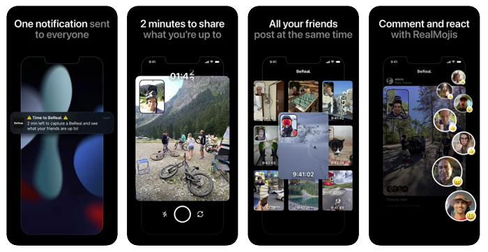 該應用程序為用戶提供了一個同步的、隨機的每日兩分鐘窗口,以上傳使用前置和後置照相頭的「BeReal」,而在這兩分鐘內你沒有時間躲藏、也沒有時間擺姿勢。