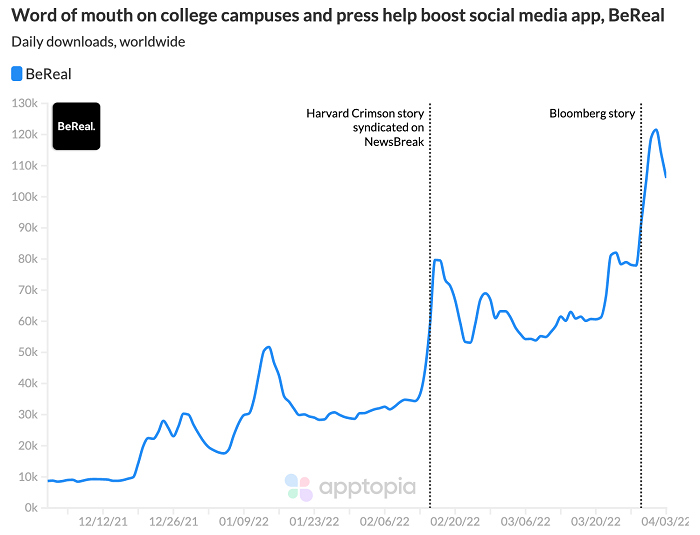 盡管成立於2020年,但近幾個月來,BeReal的增長速度急劇加快。根據apptopia的數據,今年,「BeReal」的下載量增加了約315% ,在 2022 年第一季度就被下載了 320萬次。