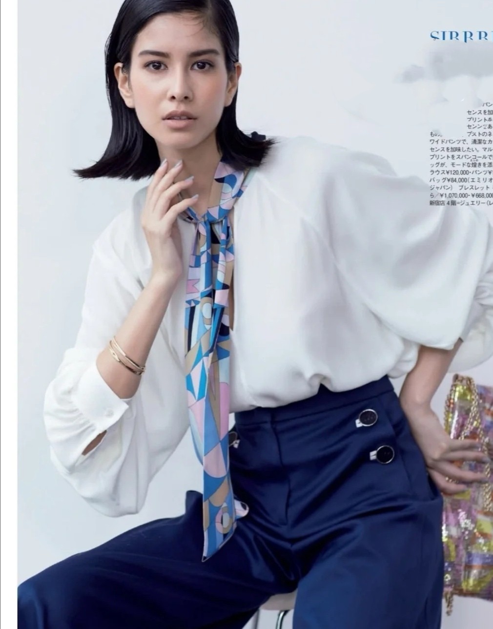 像這件印花絲巾,它的款式相當輕盈,色塊的選用也不會太浮誇,可以帶來局部修飾的作用。用它配合白色襯衫,服飾的外形就不會太無趣。