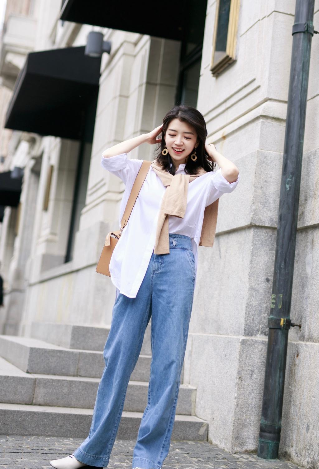 這種穿法建議以純色的襯衫為主,再在披肩的顏色上做選擇,這樣可以更好的突出披肩,提升造型的時髦度。
