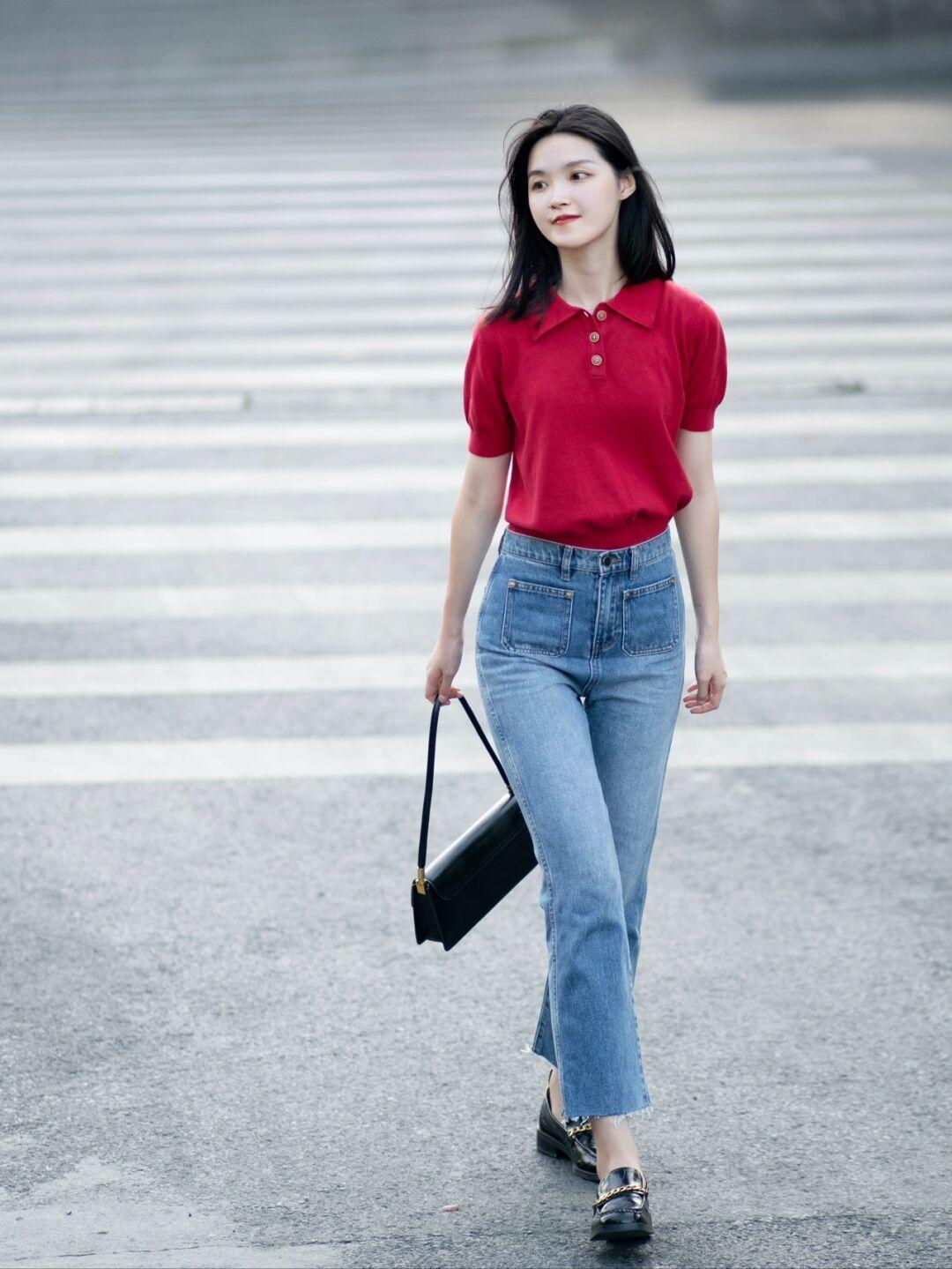 但紅色是比較挑膚色的,適合冷白皮的女性穿,能更顯白顯氣質,紅色的上衣搭配藍色的牛仔褲,優雅慵懶的風格隱隱若現。