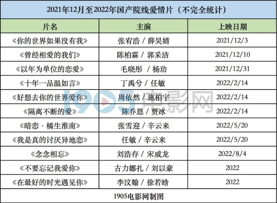 回看這兩年已上映的院線愛情片,去年有《我在時間盡頭等你》《如果聲音不記得》《明天你是否依然愛我》,今年有《你的婚禮》《我要我們在一起》《我的青春有個你》《當男人戀愛時》《陪你很久很久》《我沒談完的那場戀愛》《明天會好的》等。