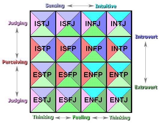測試嘗試分配四個類別:內向( Introversion )或外向( Extroversion )、實感( Sensing )或直覺( Intuition )、思考( Thinking )或情感( Feeling )、判斷( Judging )或感知( Perceiving )。取各類別的首字母來組成測試結果之類別名稱,如「INFJ」或「ENFP」。