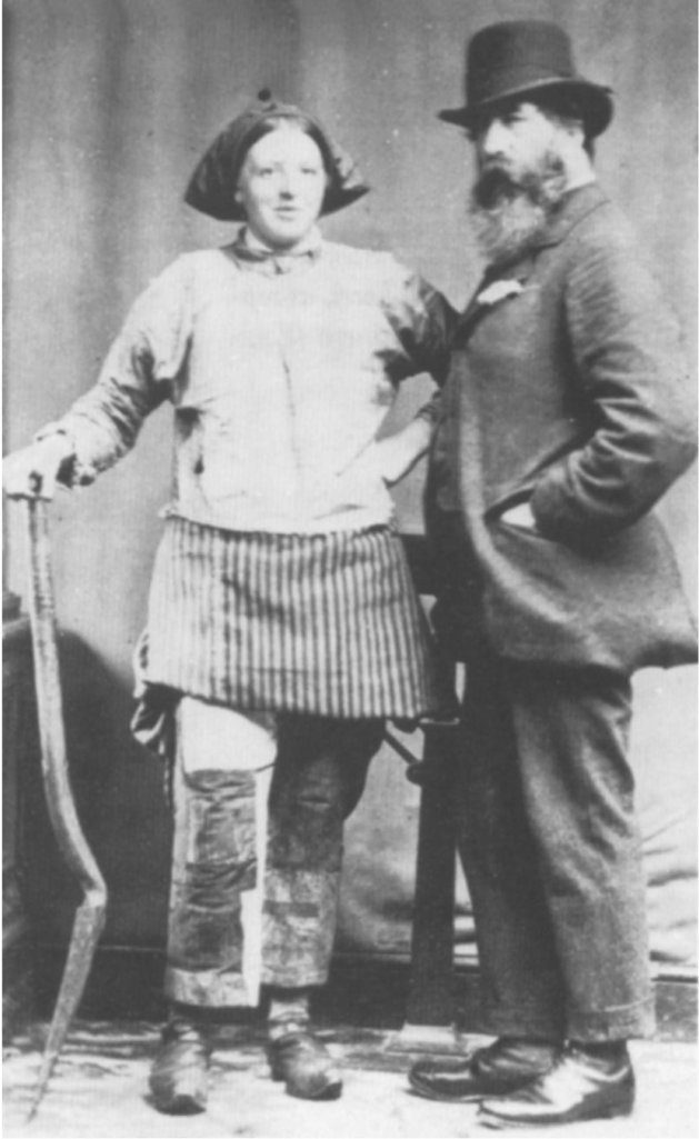 盡管法律不允許19世紀的法國女性穿長褲,但這並未阻礙工人階級女性。相反,禁令反而讓這類行為幾乎不為人知。法國女性也在多大程度上從事了與男裝相對應的工作?1810年,法律禁止女性從事煤礦地下的工作,不過該法律並未得以執行(Riot-Sarcey and Zylberberg-Hocquard 1987)。法國女性也在法國北部的礦井入口處從事運輸工作,但她們所代表的雇員比例很小,並且這一數字在1860年以後穩步下降。女性似乎一直在采礦和其他重工業領域工作,但較之英國,她們並未留下相關的圖像記錄。一些身著褲裝的女性照片暗示了這一點,照片上的女性穿著類似的長褲在鄰近的比利時煤礦運煤。值得注意的是,深諳小說創作的左拉在《萌芽》(Germinal)中將女主人公描述為身著男裝(包括長褲)的形象,這本以法國煤礦為背景的小說於1885年出版。