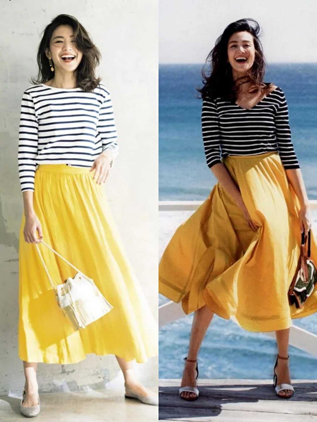 春夏季節流行的單品太多了 ,除了我們常見的純色T恤和襯衫,你還可以試試今年最流行的條紋衫,復古的條紋元素增添時尚感,黑白色條紋也比較經典耐看,相信小白也可以hold住,配上半身裙反而能夠打造出溫柔的魅力,讓你的女生味釋放出來。