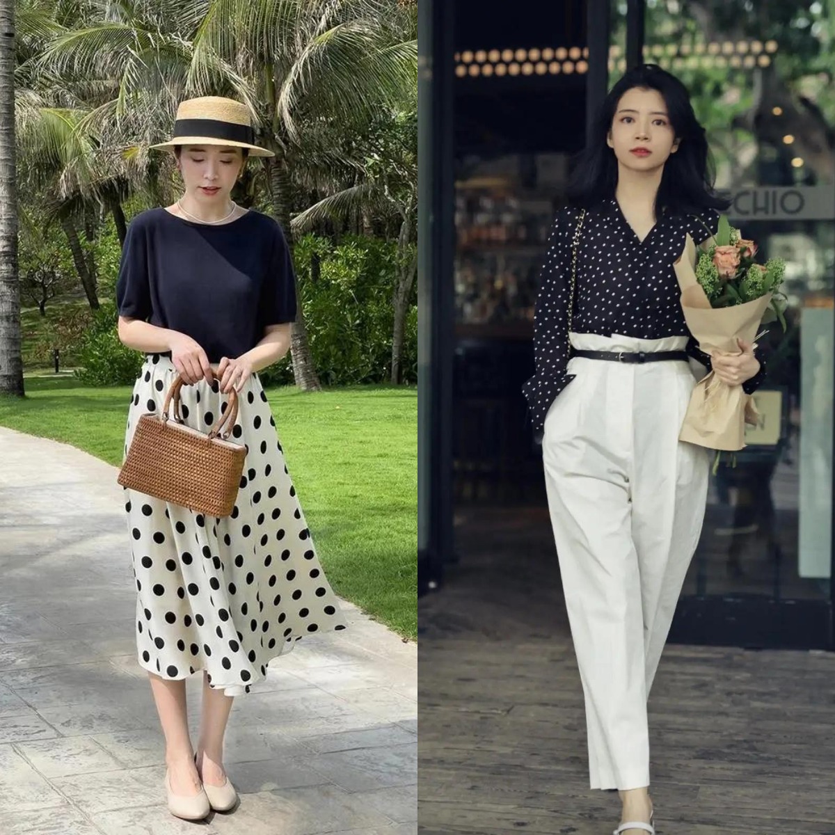 造型雖然簡單耐看,但也避免不了單調乏味,優雅的女生往往會適當利用一些時尚元素來點綴造型,增強美感,例如波點元素,相比簡約的單品明顯要時尚不少,同時也增加了一份俏皮感,具有不錯的減齡感。