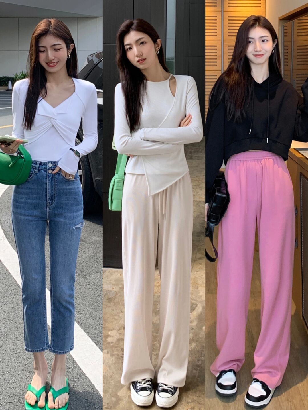 基礎色配流行色也是最近很火的造型,畢竟總是穿流行色還是容易顯得花哨的,駕馭起來太難,像這種粉色和黑色或白色的結合就能夠更好地凸顯出時尚感。白襯衫搭配紫色闊腿褲,黑西裝搭配粉色闊腿褲,都能在不經意間凸顯好氣質。