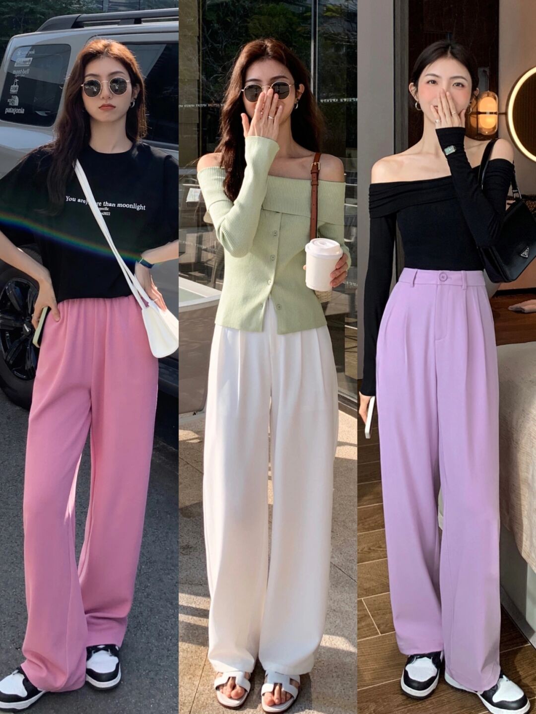 像下面這些紫色或者是粉色的闊腿褲,都是很時尚的,氣場全開,非常容易提升魅力。