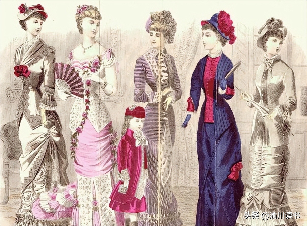 如前述,中產階級女性、工人階級女性、工人階級主婦不僅難以模仿上流服飾,而且這幾類群體之間的著裝也呈現出突出的分化特征。19世紀晚期的歐洲國家(以英國和法國為代表),中產階級女性其實從工作和身份上完全依賴於另一性別,既要承攬必要的管理協助、行政雜務、財務等職責,也不可避免要「以色娛人」,所以這就是緊身袖、裙撐、裙擺,亮色、淺色等主色調主導中產階級女性服飾的原因。這一時期,隨著新的苯胺染料引入,種類更為繁多的色調得以實現。