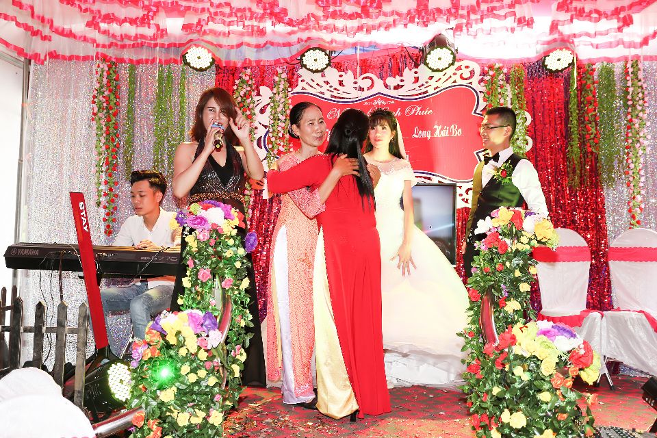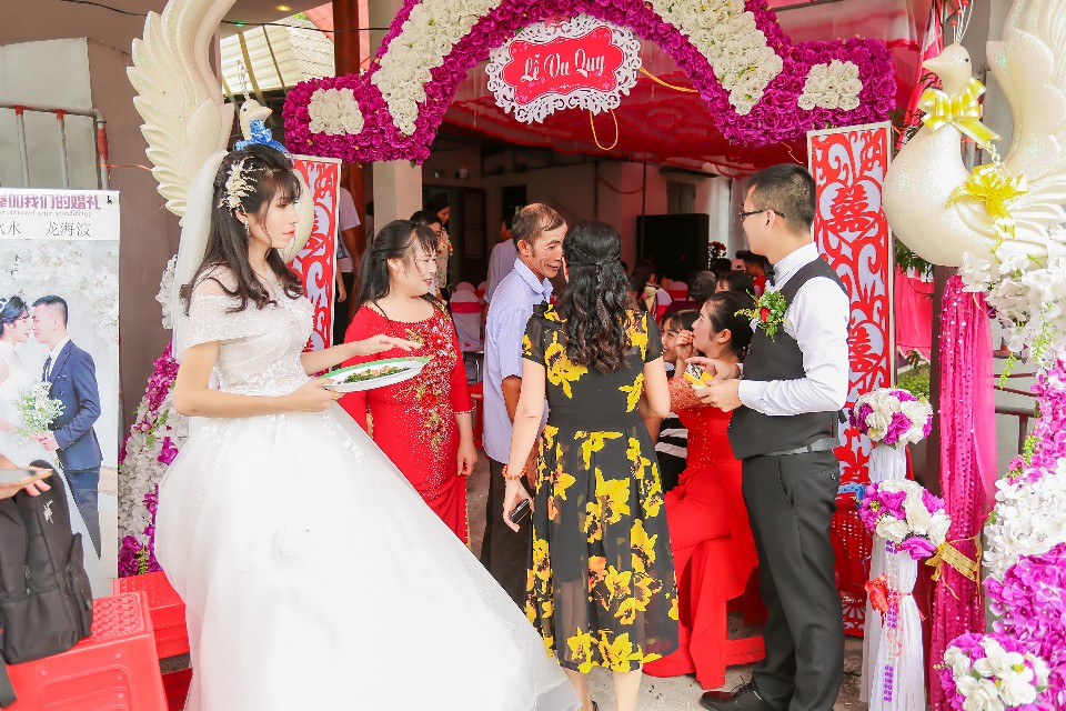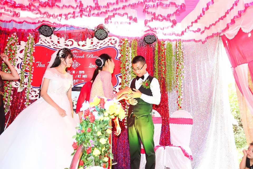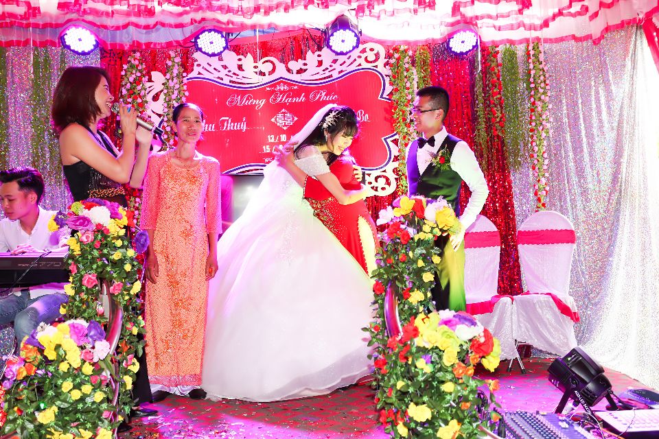 這些禮物即叫彩禮,必須是男方出錢買,在越南各大婚禮店就可以預定,大概需要7000-15000人民幣左右。如果男方不懂去哪裡定又不懂越南語你可以和女方父母一起去定就好了,定好後男方付款就行然後辦婚禮的日子婚禮店會按時給你送過來不需要再付給婚禮店其它費用。再後就是租婚禮要用的服裝雙方父母都要穿的,新人雙方的。(如下圖)