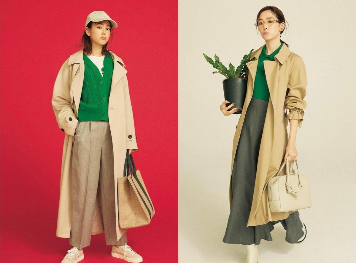 卡其色的長款風衣,它是過膝的設計,增強靈動感和隨性美。顏色的運用也具備十足的親和力,裡面疊加的內搭不可勝數。為了構造出減齡作用,可以採取綠色單品的配合。不管駕馭裙裝還是褲裝,都能和風衣組成一對CP。