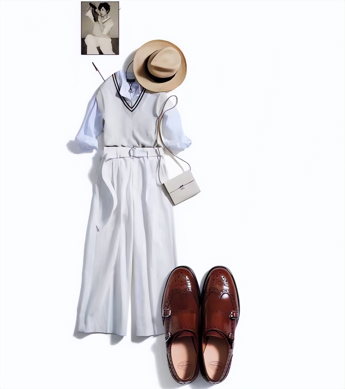 針織馬甲的疊穿,上下裝單品風格的混搭,棕色皮鞋的強化,衍生出一套介於正式&休閒之間的行頭。對了,米色禮帽的中性點綴,方形小包的利落影響,也是不可忽略的細節哦。