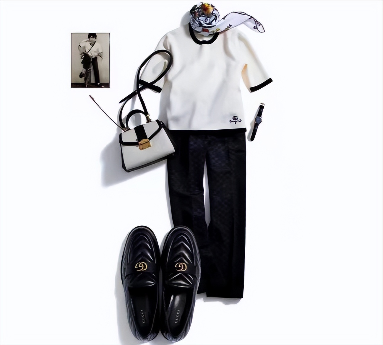 一件白色T恤,領口、袖口撞色,下擺LOGO點綴,質感面料,這些都是大女生的講究細節。搭配黑色暗花直筒褲,休閒不失利落。