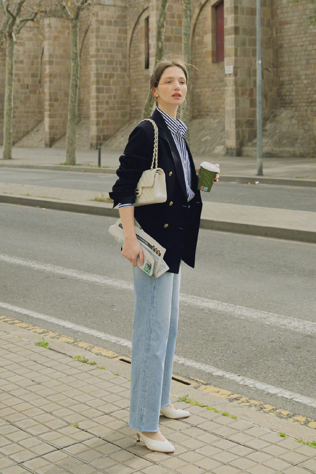 這套藍白豎條紋襯衫,配上黑色西裝的造型簡約幹練,下身的淺藍色牛仔直筒褲,加上白色尖頭高跟鞋,完全削弱了上半身搭配帶來的厚重感,同時又顯得女生味十足。