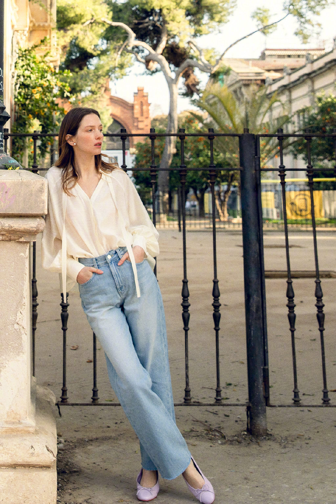 春天最不能錯過的一款單品就是白襯衫了,下面這款白襯衫,相比於普通款式的襯衫來說更有設計感,領口帶有兩條飄帶的設計,增添了隨性大方的感覺,下身選擇一款淺藍色高腰牛仔直筒褲,修飾腿型又能顯腿長。
