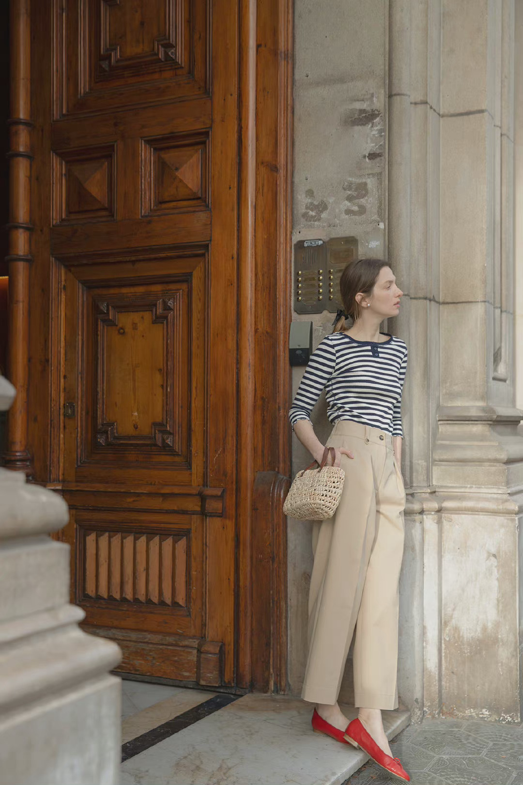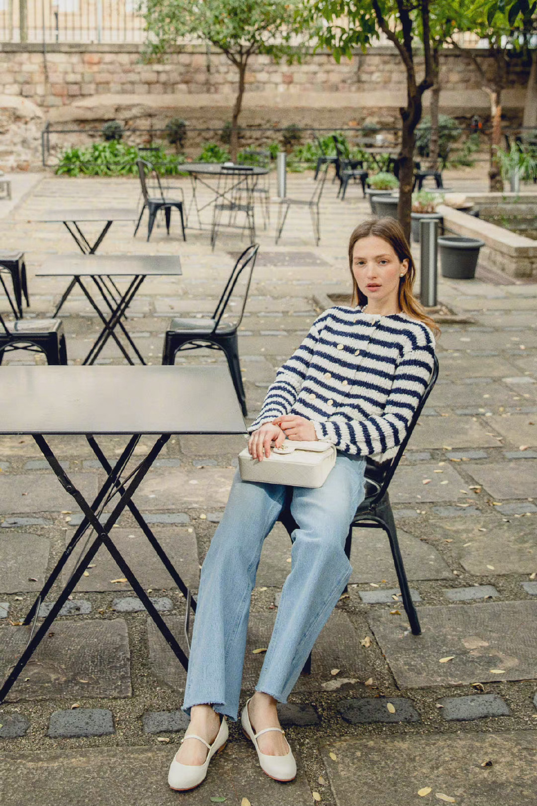 藍白條紋元素的上衣,不管是針織衫還是套頭衫,都是那麼的百搭高級,腳上搭配上一雙杏仁頭設計的白色瑪麗珍鞋,不僅可以凸顯出精緻感,而且這種娃娃鞋穿上腳還特別減齡。