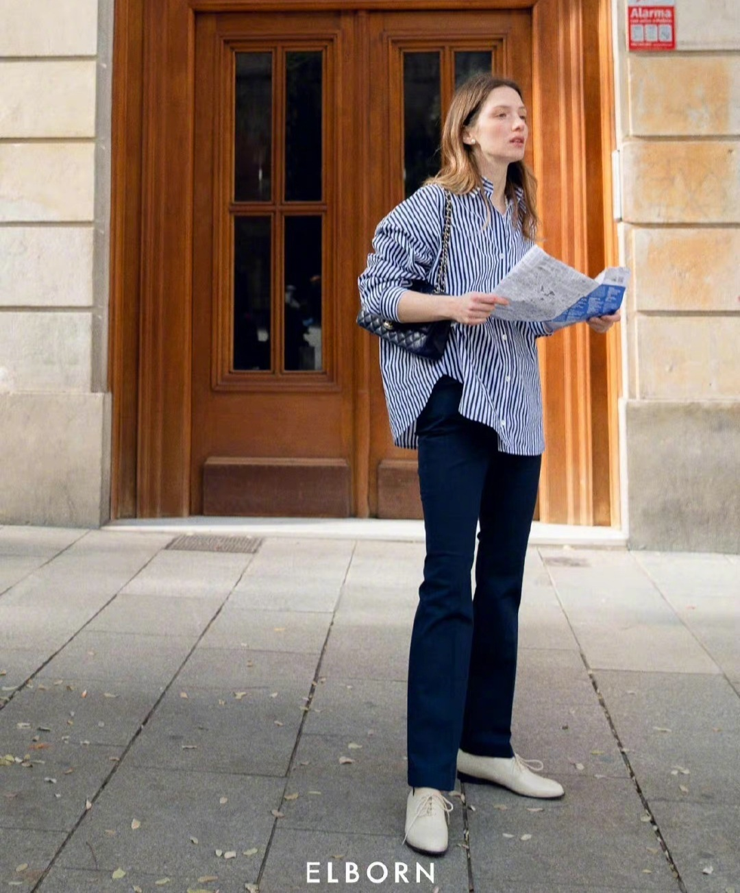 對於普通人來說,想要搭配出高級感,首先就要選擇那些基礎百搭的單品來進行搭配,這些單品的實穿性較高,而且利用率也較強,像這款藍白條紋襯衣以及深藍色西裝闊腿褲,都是屬於基礎的單品,搭配在一起竟然是那麼的協調耐看,配上黑色棱格包以及白色綁帶平底鞋,精緻又時髦。