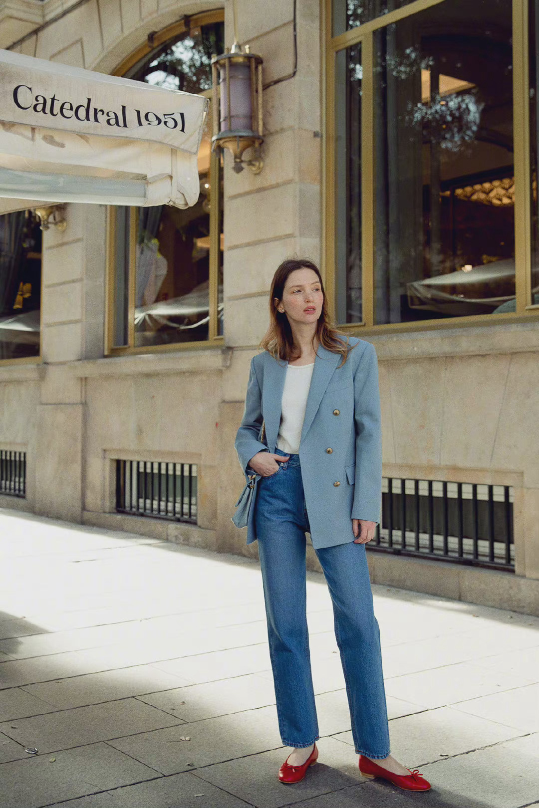 淺藍色和牛仔藍搭配在一起,意外的協調與高級,這身淺藍色西服配上牛仔藍長褲的造型,幹練帥氣,很好地顯現出了都市時髦女性身上的颯爽感,配上亮眼的紅色平底鞋,讓造型不顯沉悶單調。