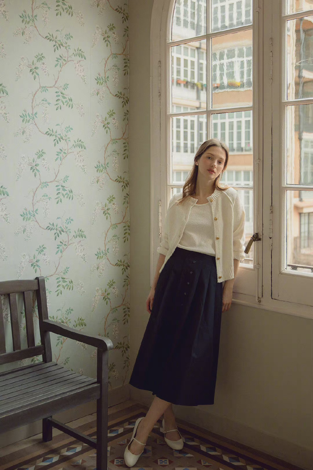 千萬不要小瞧造型當中紐扣裝飾的作用,它可以為我們的造型帶來意外的精緻感,這身白色針織衫配上黑色高腰半身裙的造型當中,針織衫以及半身裙表面都加入了一字排扣的設計,增添了大氣感,同時也讓造型不顯單調。