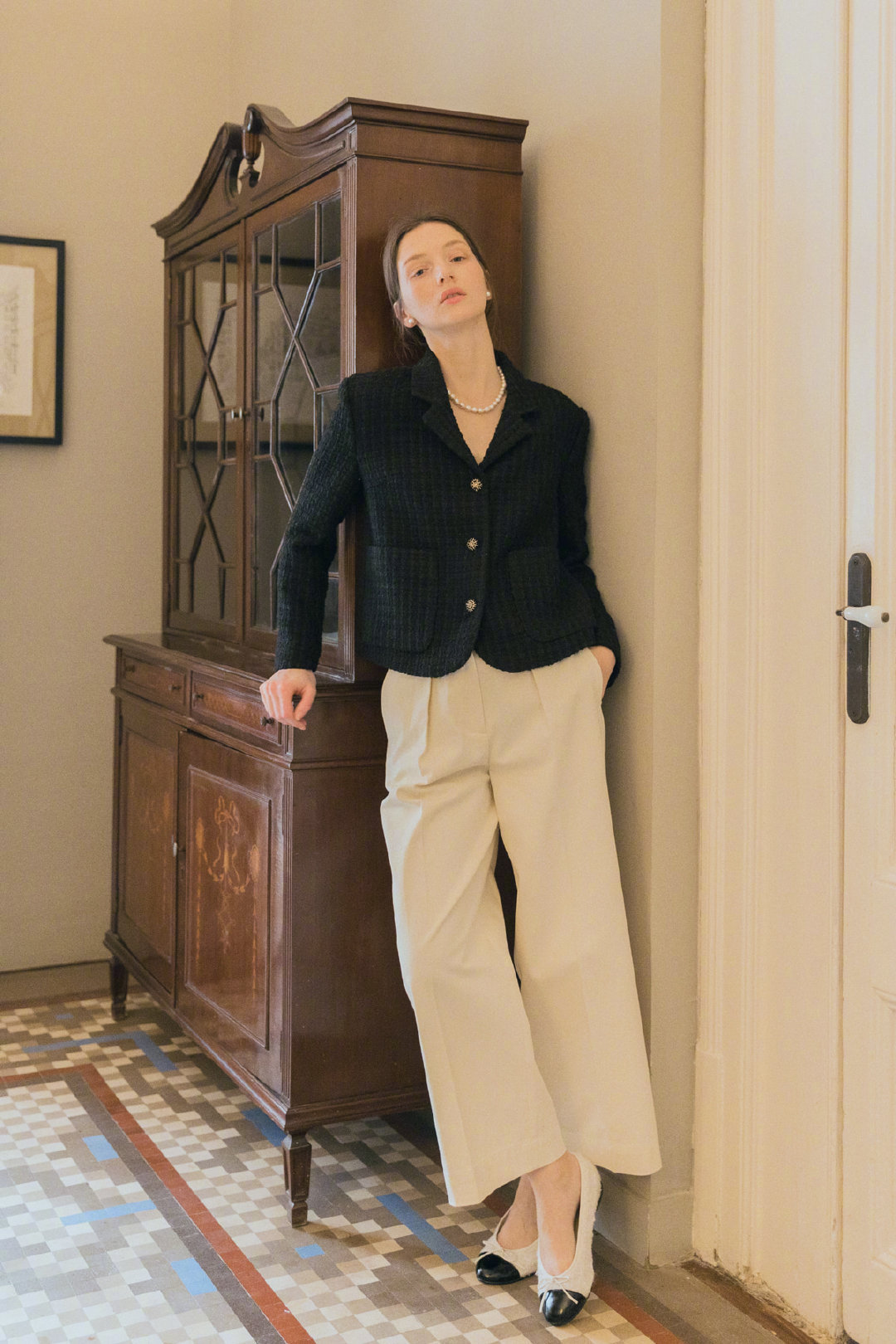 具有高級感的裝扮,當然少不了各種各樣配飾的裝扮,這身小香風外套的造型當中,上半身是一款黑色毛呢材質的短外套,配上白色高腰西裝闊腿褲,經典大方又很帥氣,女生身上佩戴的珍珠項鏈以及珍珠耳飾,在細節上都增強了造型的精緻感。