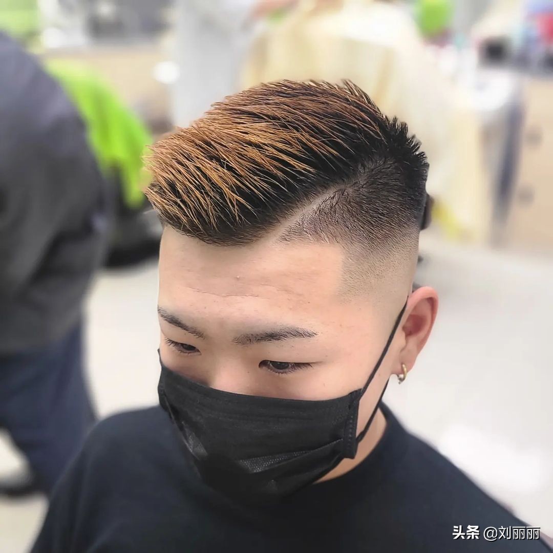 這位小夥就選擇了二八分造型,並在分線的位置用總刮刀刮了刮,更加的個性,配上金黃色的染髮。也是很潮流帥氣的。