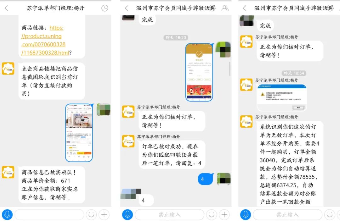 做了兩筆後,小王又被拉到了一個叫「溫州市蘇寧會員同城手牌激活群」的「曲歌殿」APP群,開始做單賺取傭金,小王又做了第三筆390元,返還417元,這時對方說要開始做四聯單了。1350、1202、3903、9010,小王連做了四單,可是客服說小王最後一單做錯了,應該要買四個商品隻買了一個,不能返現,得再補三單的錢27030元。