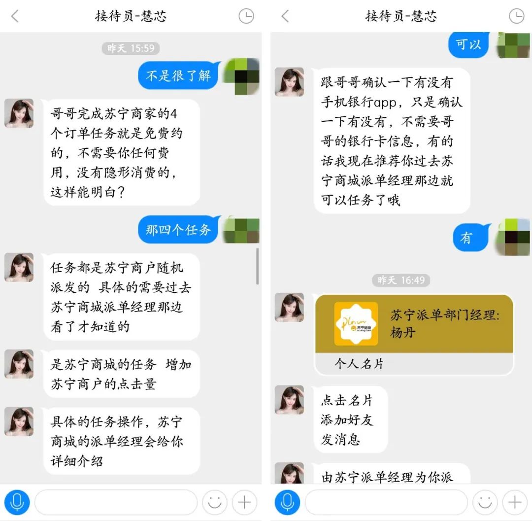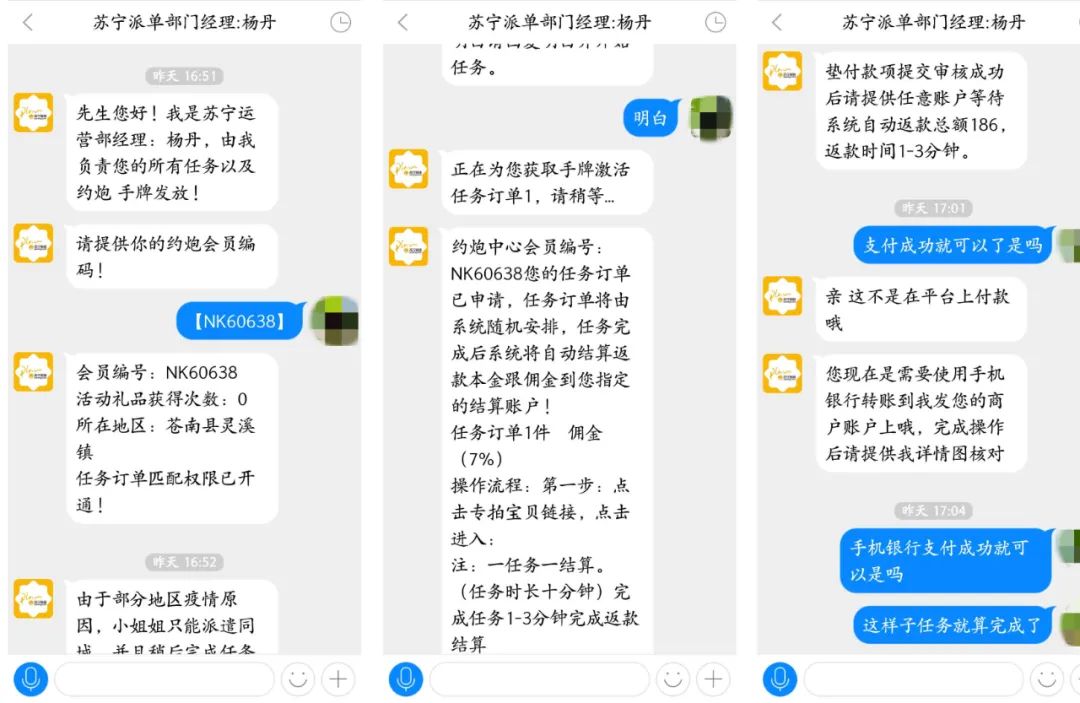 隨後小王便聯絡了「蘇寧派單部門經理楊丹」,「楊經理」讓他在蘇寧易購上下單商品,但是不要在上面付款,而是將金額轉帳到他指定的銀行帳戶上。第一筆,小王下單174元並轉帳到指定帳戶,對方返還了186元。第二筆,小王做了671元,對方返還了718元。