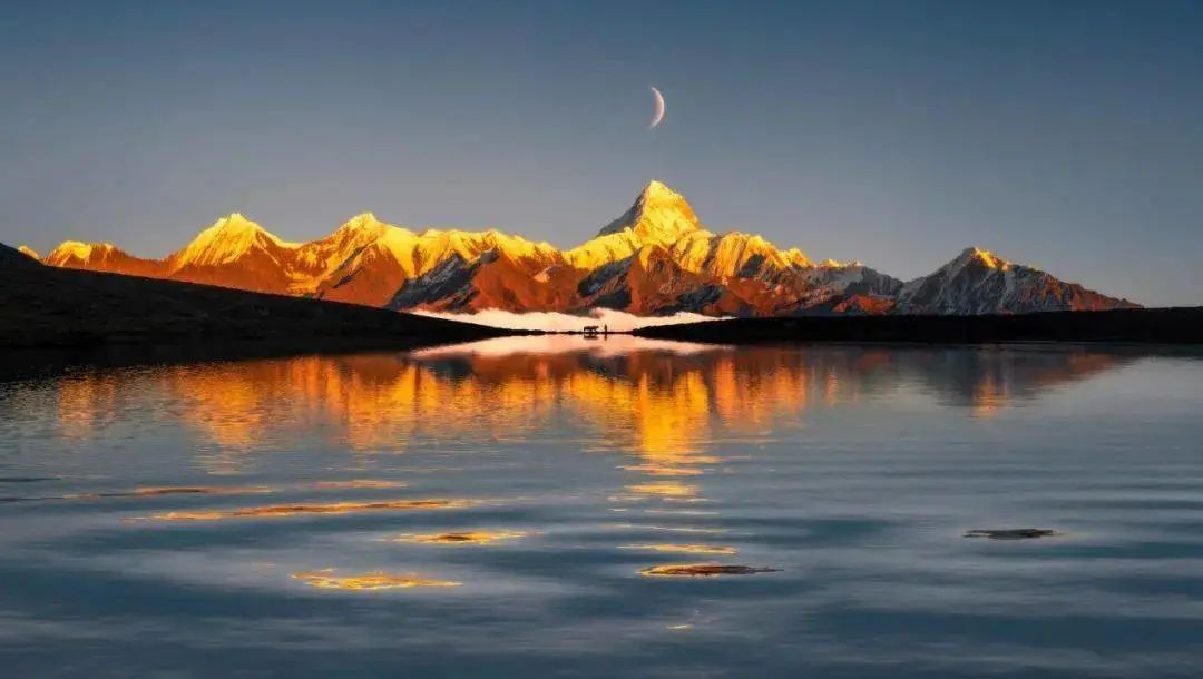 當你走到冷嘎措的對面,正對著貢嘎主峰,又是不一樣的感覺,那時候才能明白「貢嘎之眼」名字的含義。主峰倒映在海子上,如同清澈的眼眸。越往高處爬,瞳孔越放越大,感覺就像是在凝視著自己一樣。如果你想看一場難忘的日出日落,冷嘎措絕對不會讓你失望。