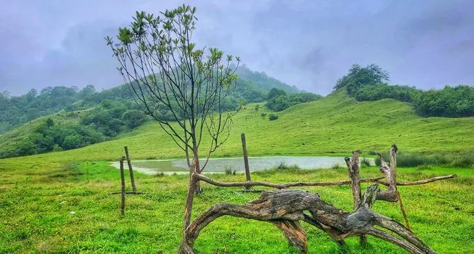 是一個靜躺在平地之上的海子,有藍天白雲的相伴,也有雪山反對,褪去了秋天的顏色,披上了一身銀色的外套,靜躺在平地之巔。在這片寬廣無垠的大草坪上,有厚厚的草甸和開闊的濕地,四周彩林映托在遠處的雪山上,多部影視作品曾在此拍攝。