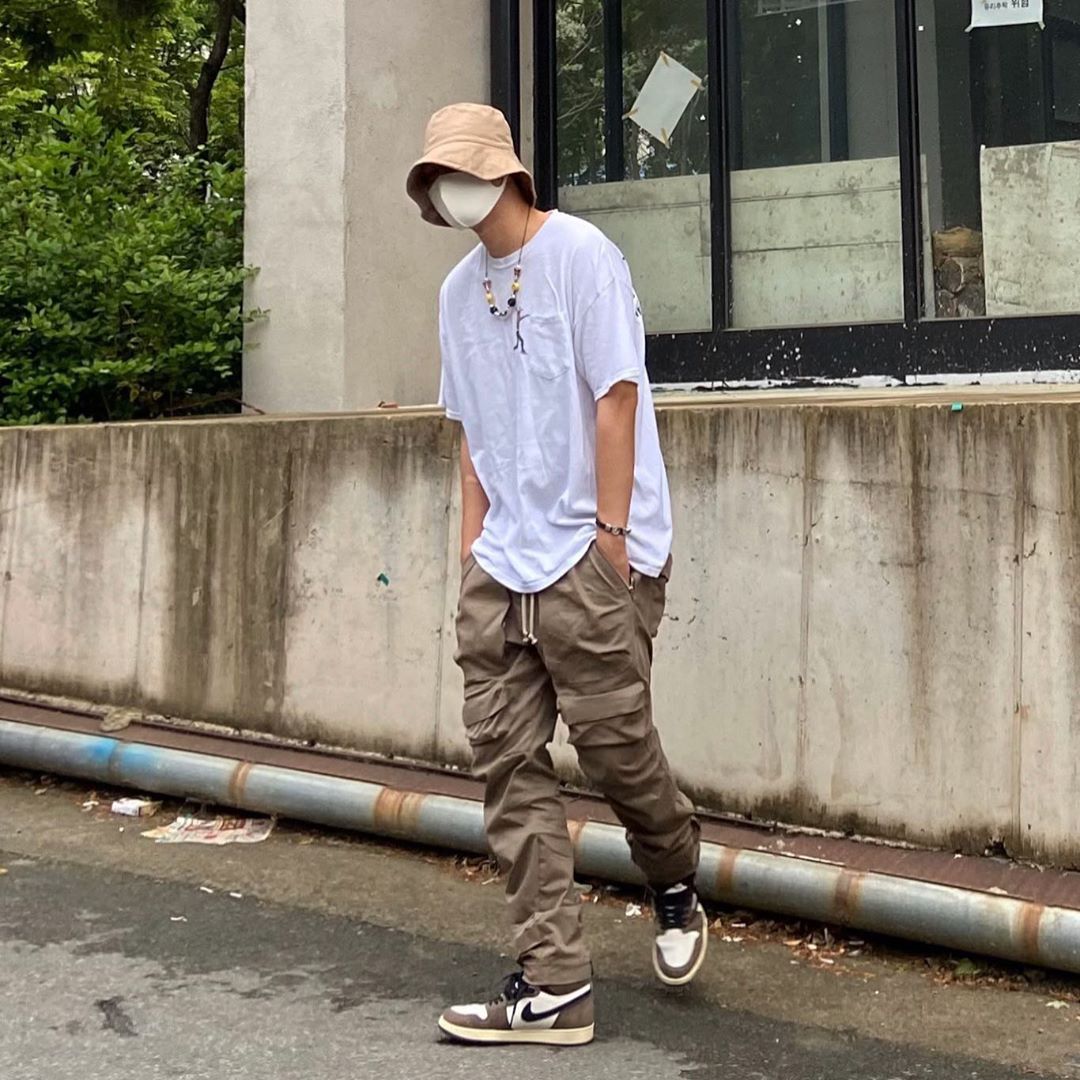 漁夫帽 + 白色印花短袖 + 卡其口袋工裝褲 + 高幫運動鞋