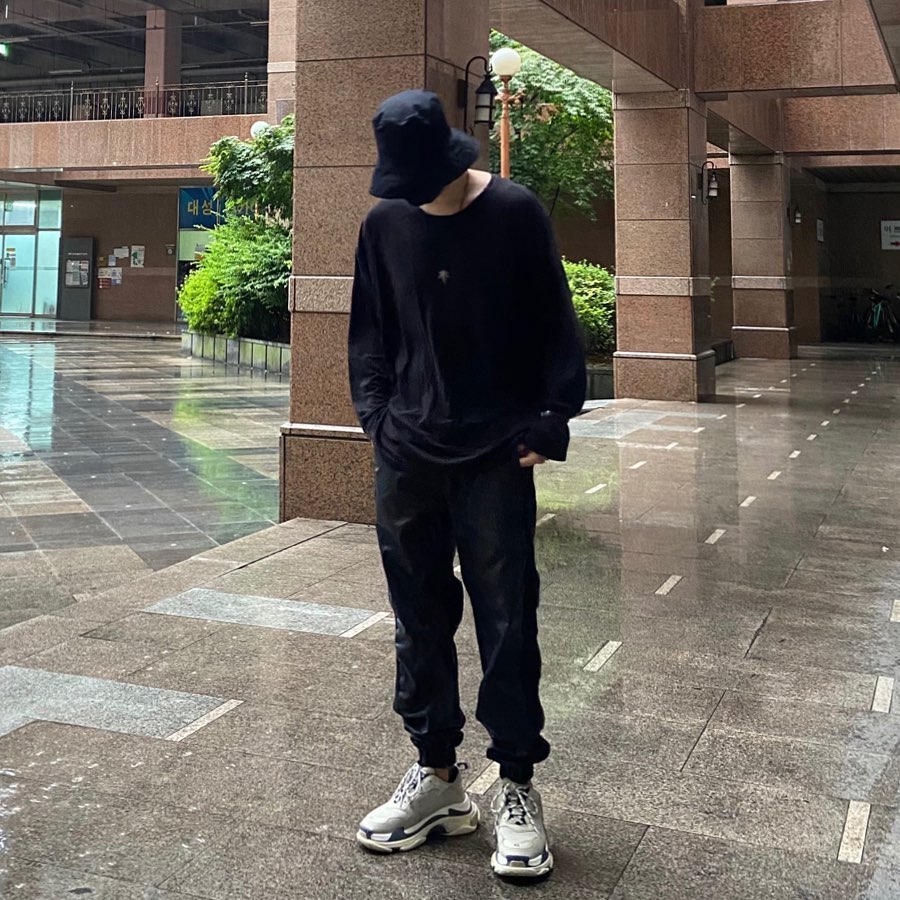 黑色漁夫帽 + 黑色暑假褲 + 灰色老爹鞋