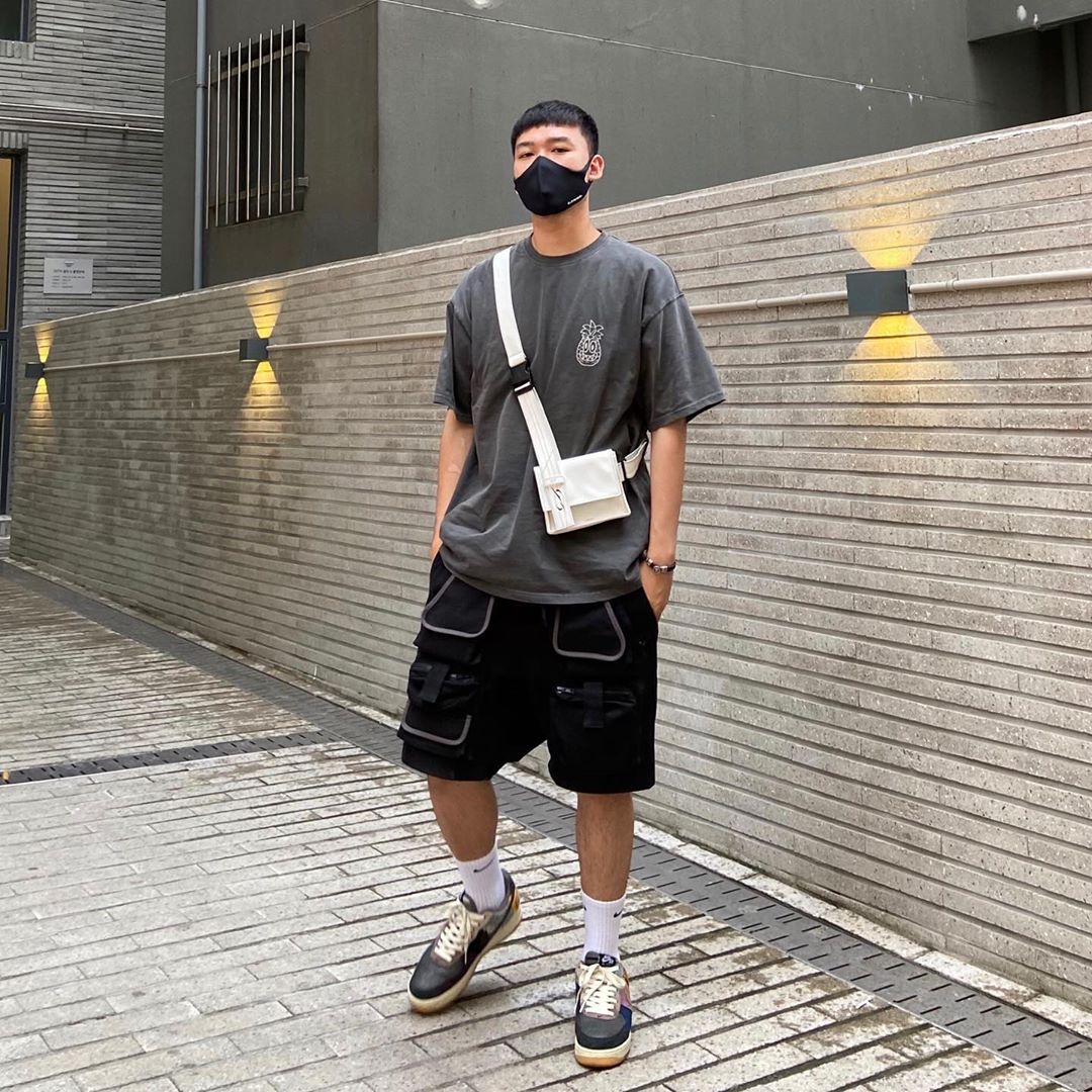 街頭風與機能風格的組合同樣是近些年流行的混搭方式,一件小logo的水洗短袖街頭味十足。機能短褲為夏天出行提供便捷,無論什麼小物品都可以裝在身上。