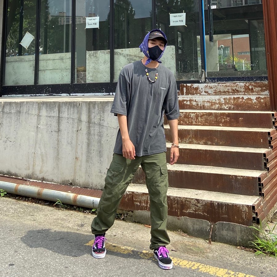 同樣是綠色工裝褲的搭配,上身可以選擇高街風水洗短袖,雖然是純色T恤,但是本身的做舊水洗效果已經夠獨特了。