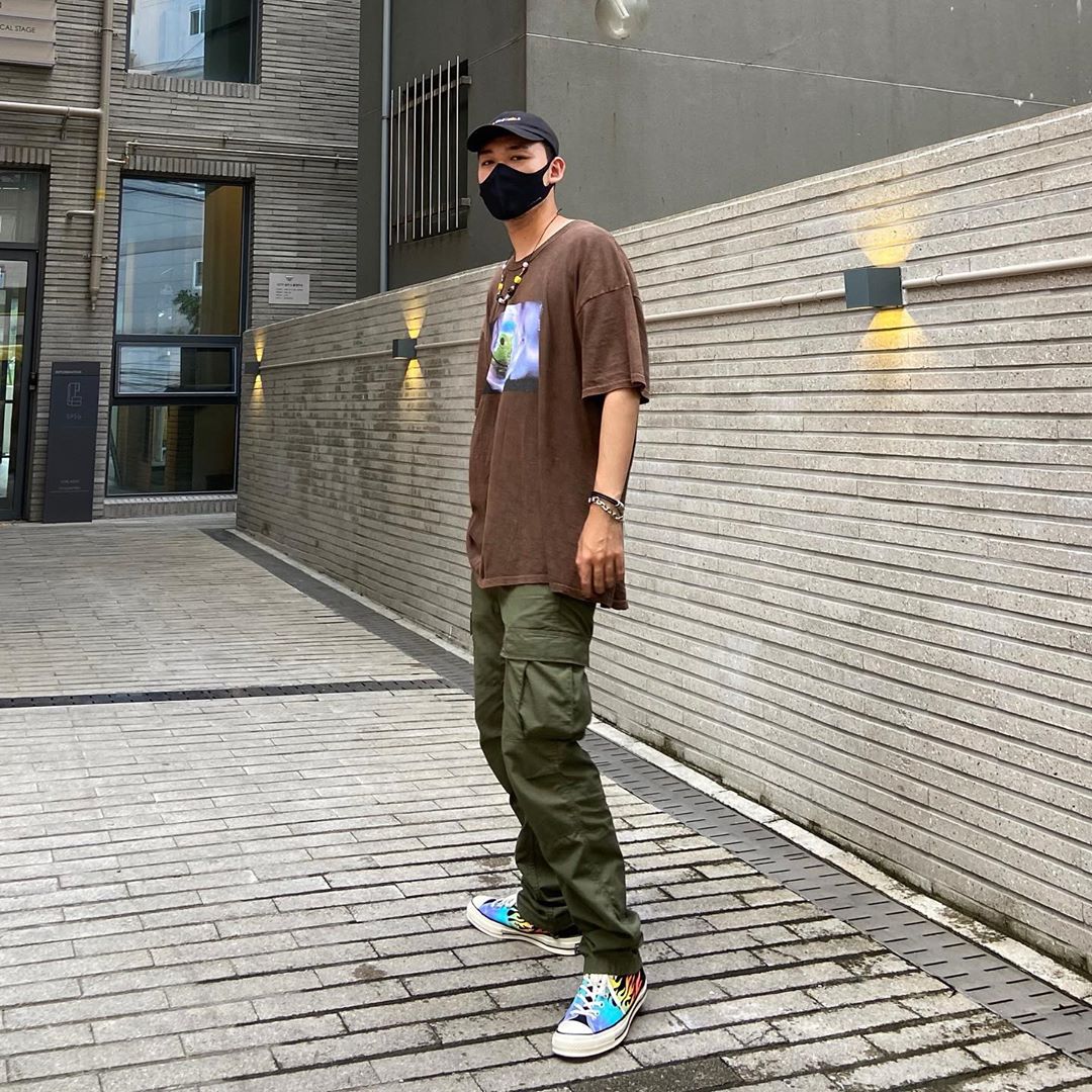 街頭印花短袖 + 綠色大口袋工裝褲 + 火焰帆布鞋