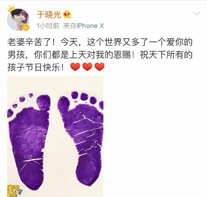 正值六一兒童節,秋瓷炫恰巧在首爾產子,母子平安。於曉光第一時間在微博曬出寶寶的腳丫照報平安,言語間都是對老婆秋瓷炫的疼惜。秋瓷炫隨後也發文報平安,稱會盡心教育好孩子。六一出生的孩子,想必也會擁有一個快樂的童年。