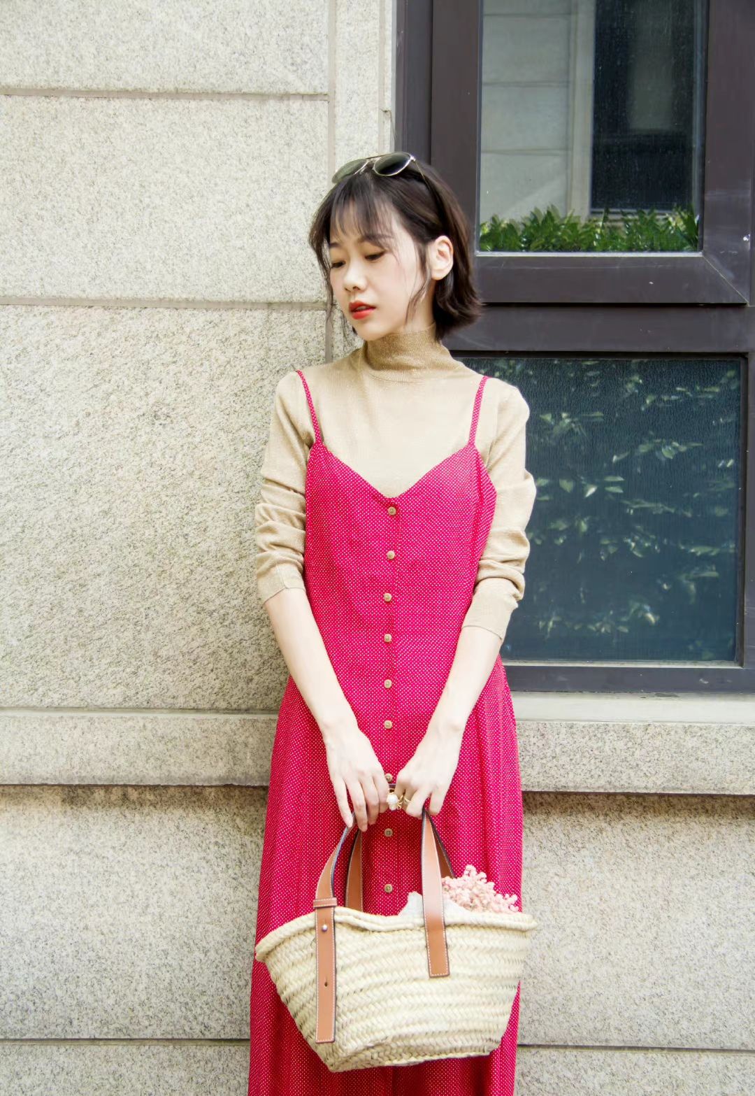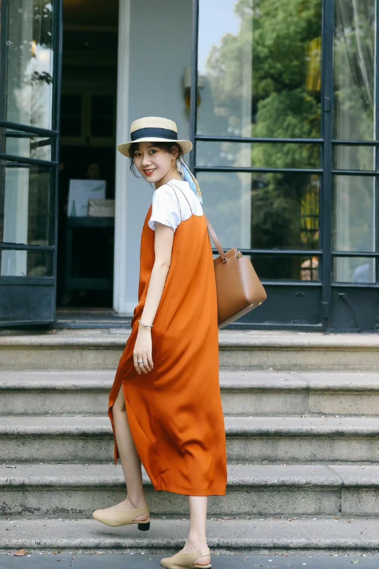 疊穿搭配有很多詮釋方式,如果想在穿吊帶連衣裙的時候揚長避短,可以嘗試一下用白色的T恤疊穿吊帶連衣裙,因為單穿吊帶連衣裙容易暴露手臂,很容易顯胖,疊穿上T恤就能夠幫助我們遮住手臂的拜拜肉,層次感也能夠順勢得到提升,下面的博主用這種南瓜色吊帶裙配上白色t恤,撞色的搭配也很有層次。
