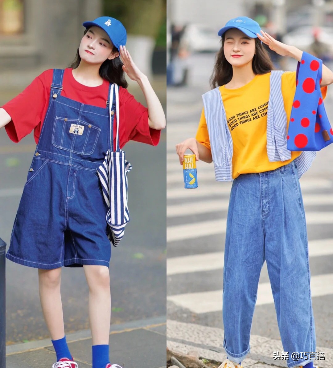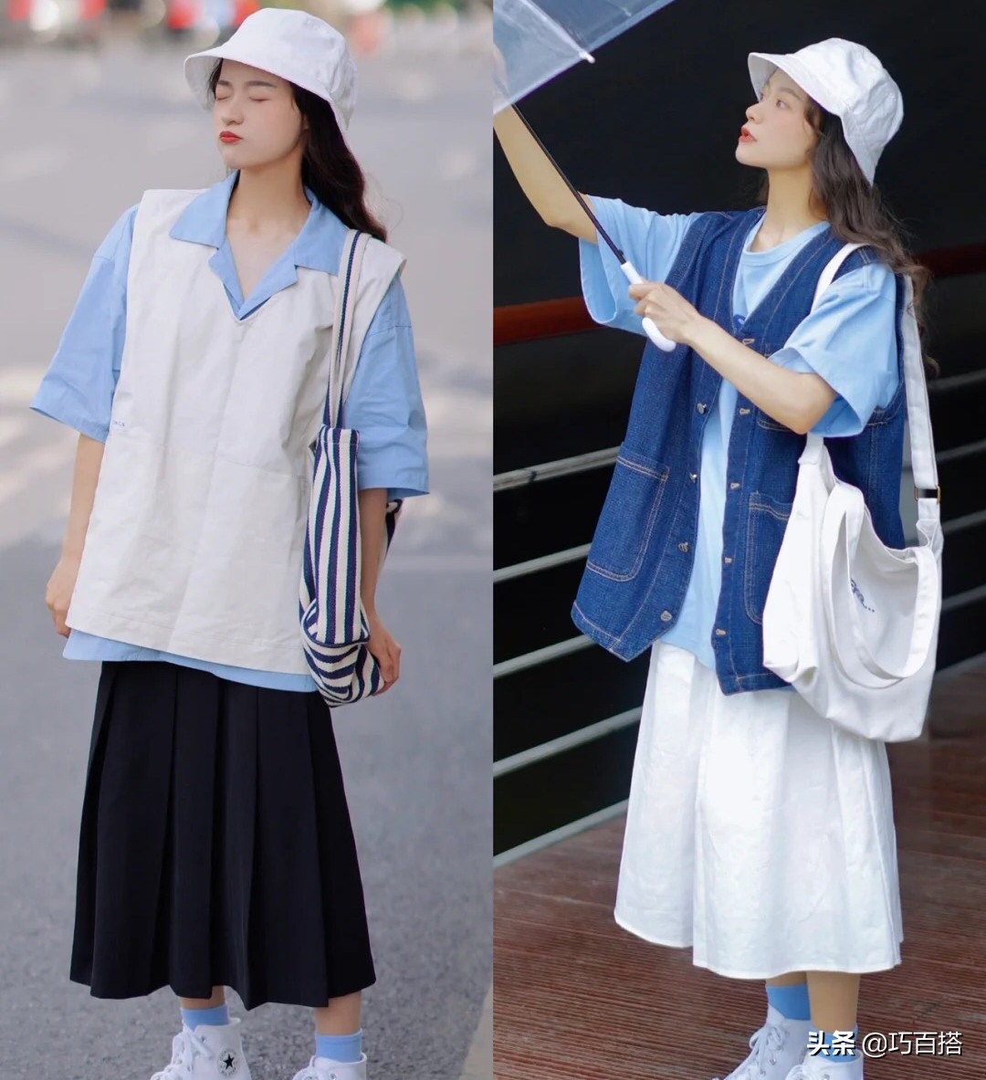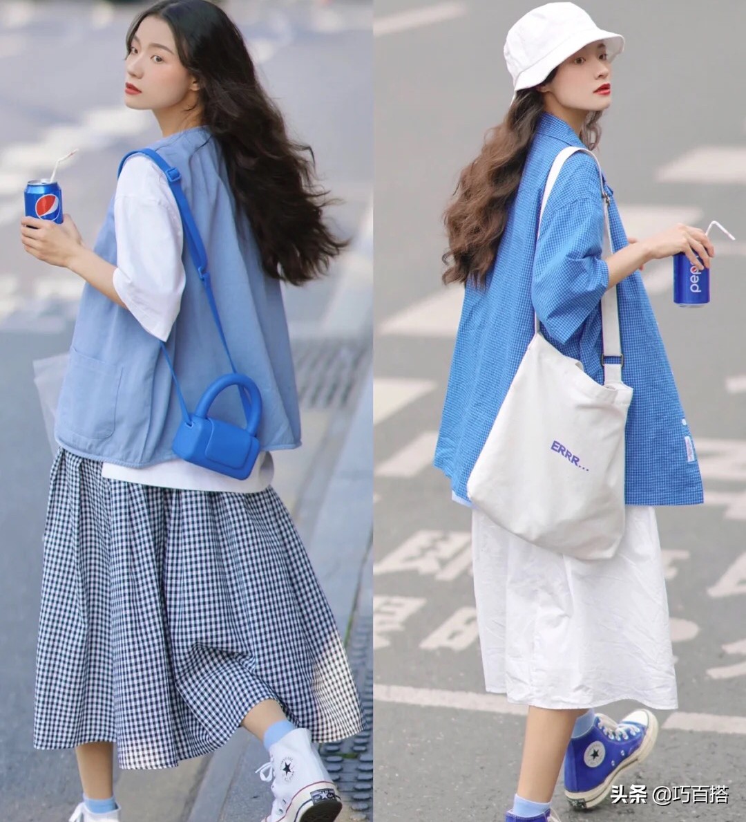 而這樣的搭配,帶來的減齡風也非常舒適,清新透氣,元氣滿滿。其中,藍色就是加分項,夏季穿衣還可以顯得清涼解暑。