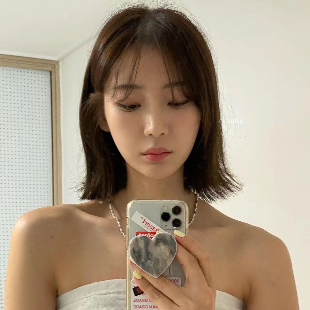 圖片中這款髮型就是標準的齊脖髮型,適合脖子細長,臉型圓潤的女士。自然的空氣瀏海,把臉型修飾得更好看。微微反翹的髮尾,更加凸顯優美的肩頸線。自然的淺棕色發色,顯白又時尚。