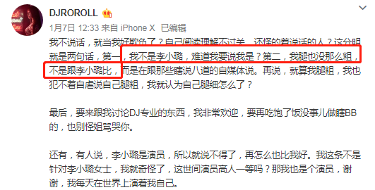 打碟女生在文章開頭否認自己內涵李小璐,兩句話是兩個意思,一是表示自己不是李小璐,二是自己腿沒那麼粗,並不是在和李小璐比較,只是單純吐槽自己。