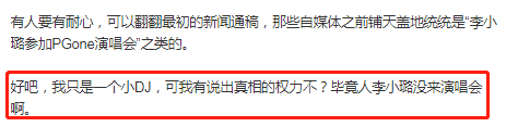 打碟女生還不忘為李小璐澄清緋聞,稱她並沒有出現在演唱會現場,只是一些媒體在跟風帶節奏。