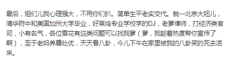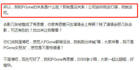 眼看傳聞愈演愈烈,打碟女生不勝其煩,連發兩條微博直接否認內涵李小璐,並澄清了和pgone的戀情。