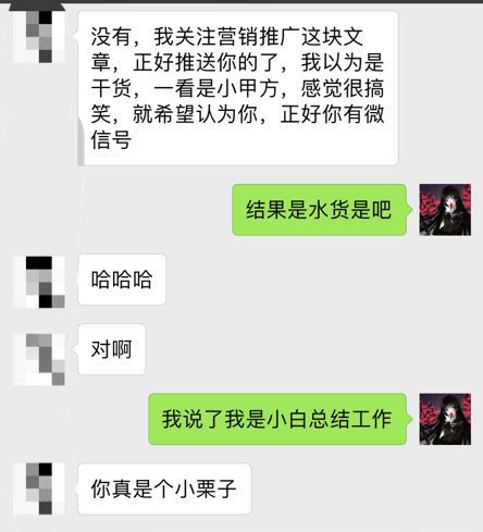 這位大哥通過我的一篇文章加了我,然後嘲笑我文章寫得水,沒有好文分享,最後得出結論:我很可愛!我可不可愛還用它說嗎?一會叫我小甲方,一會叫我小栗子,不知道的還以為關係匪淺呢。