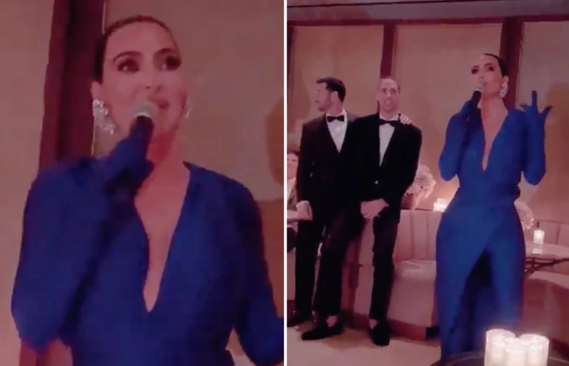 宴會上,卡戴珊身穿寶藍色連衣裙外加鑽石大耳飾,以過來人身份舉杯祝賀,就是這賀詞…有點跑偏了。