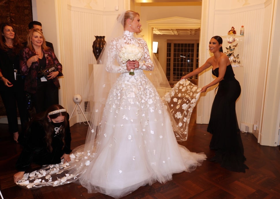 正式儀式開始前,她還特意跑到後臺安撫新娘子的緊張情緒,貼心為希爾頓提裙整理裙擺。