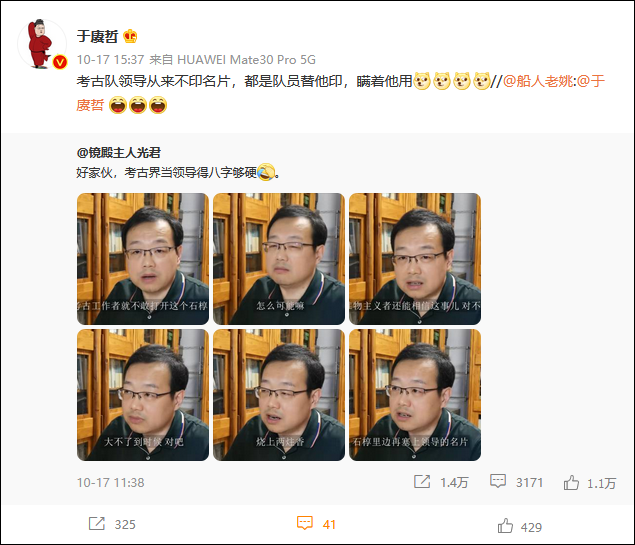 面對網友們的一眾調侃,於賡哲教授在17日再揭「行業內幕」:「考古隊上級主管從來不印名片,都是隊員替他印,瞞著他用(狗頭保命)。」