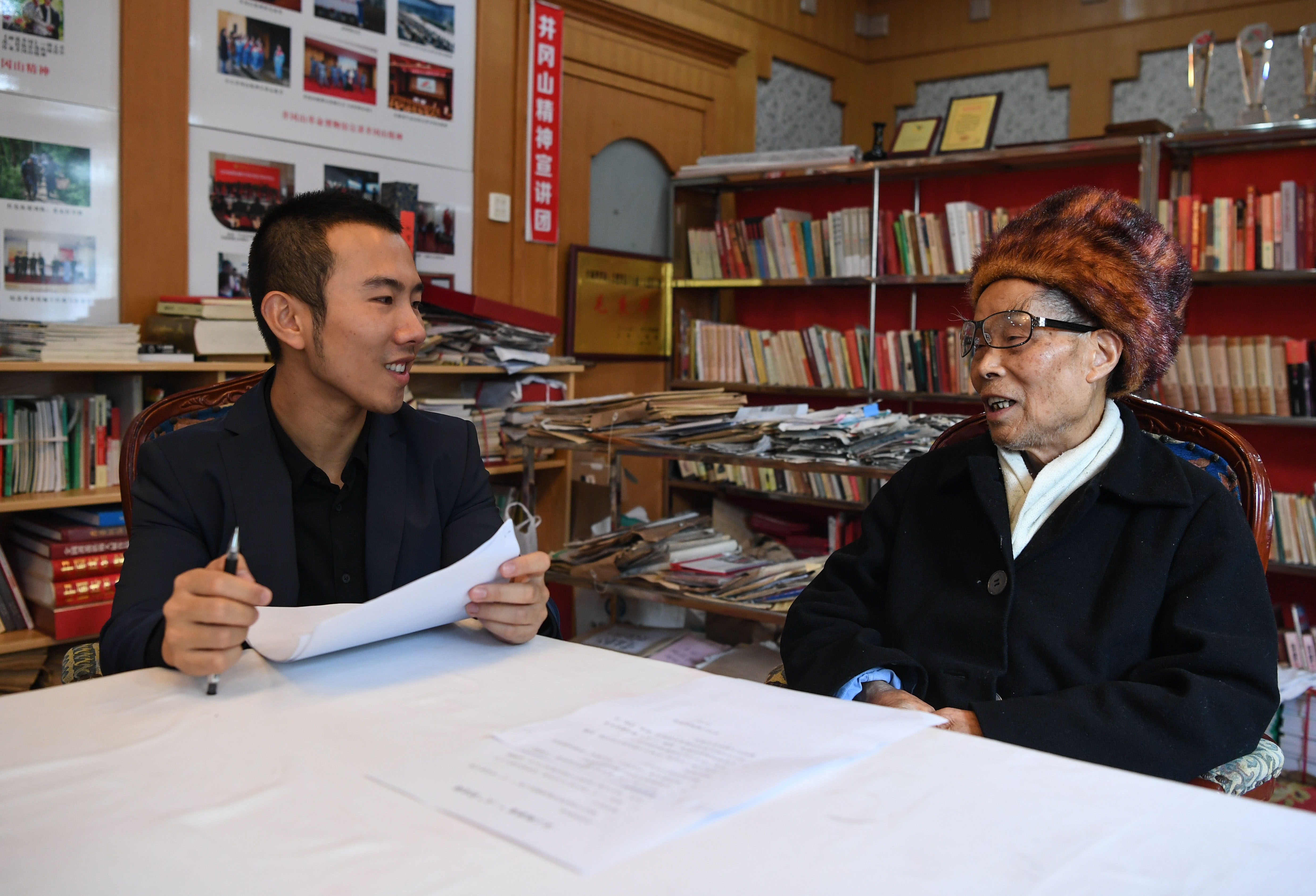毛秉華(右)生前和孫子毛浩夫學習、探討井岡山革命歷史。新華社記者申宏攝