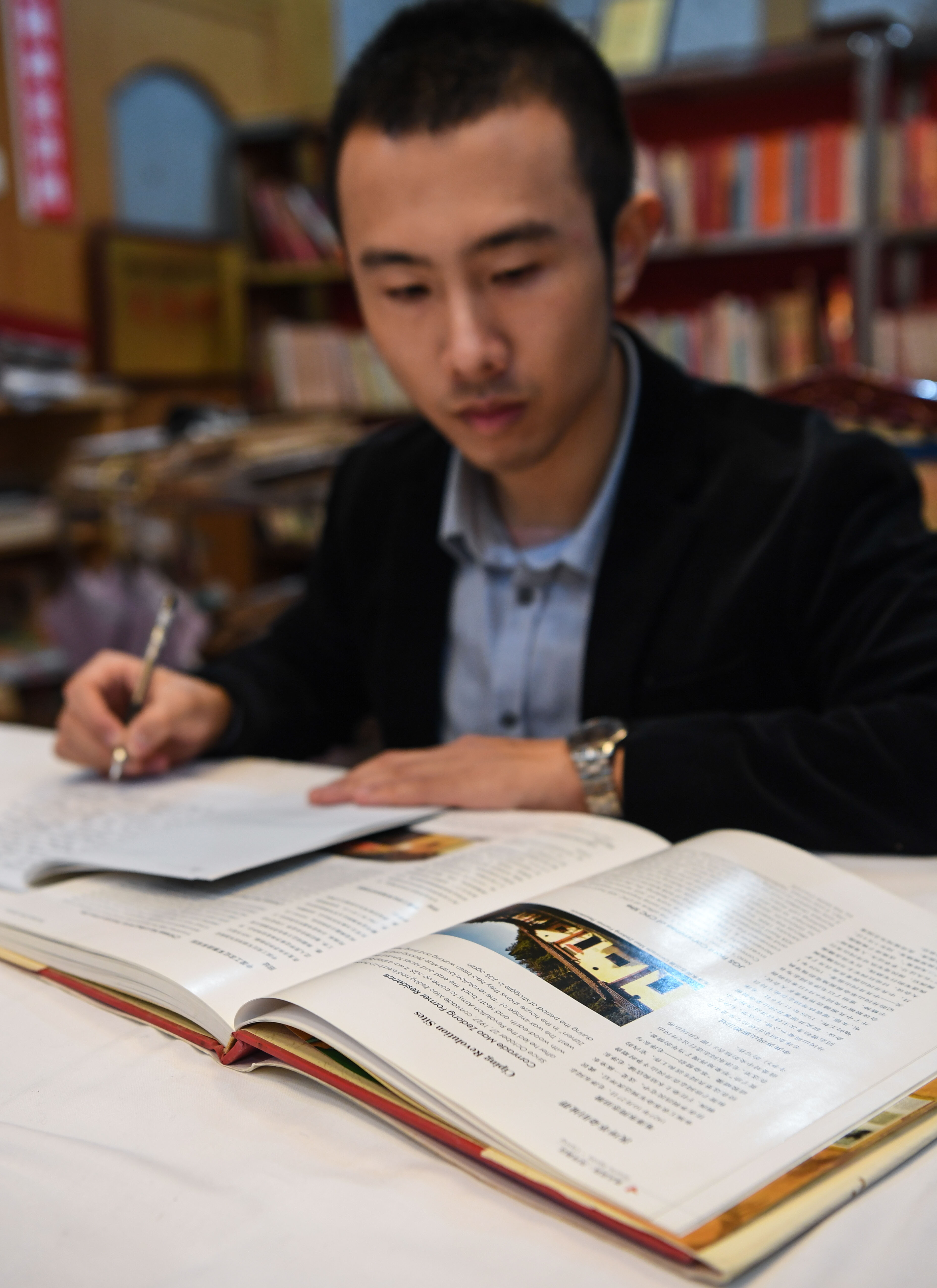 毛浩夫在研讀有關井岡山的英文資料,豐富英文講解素材。新華社記者申宏攝