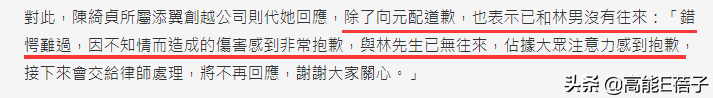 對此陳綺貞工作室也趕快回應,表示和林男已經沒有往來,而且「錯愕難過」,「因不知情而造成的傷害感到非常抱歉」。